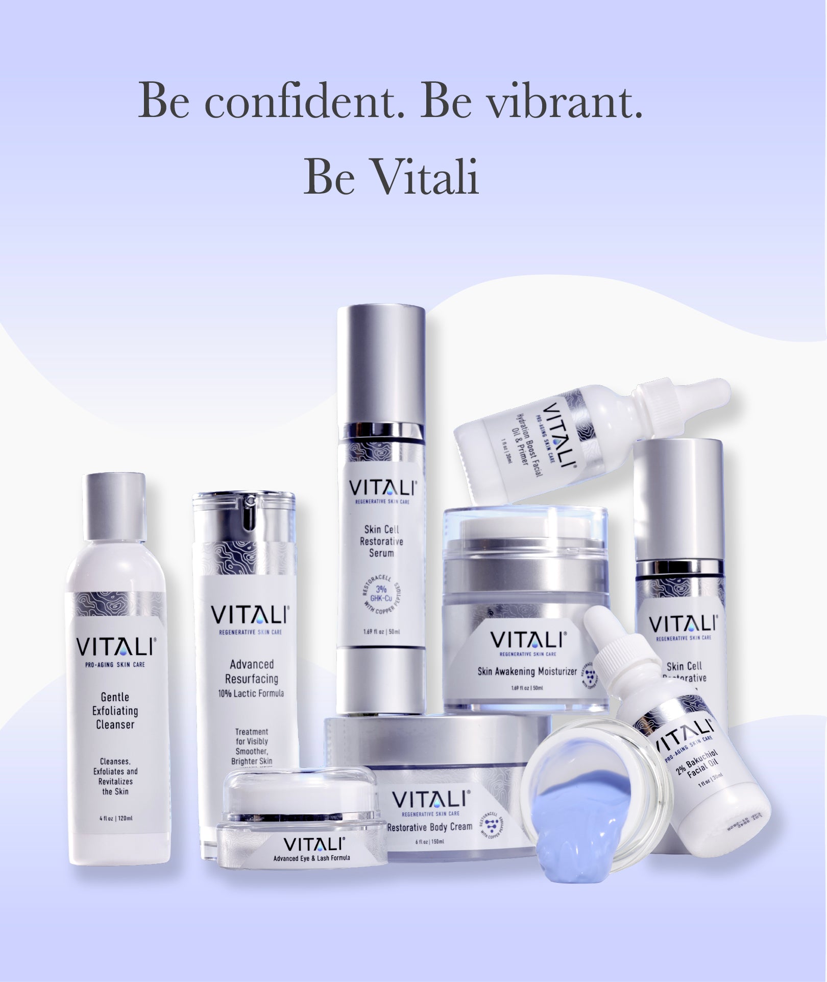Vitali’s GHK-Cu skin care collection contains the precise amount of Copper Peptides (GHK-Cu) for optimal results. The rich blues in our products show that our formulas are some of the most potent on the market allowing deep penetration to generate collagen and elastin, signal the production of more youthful skin, neutralize wrinkle-causing free radicals and much more.