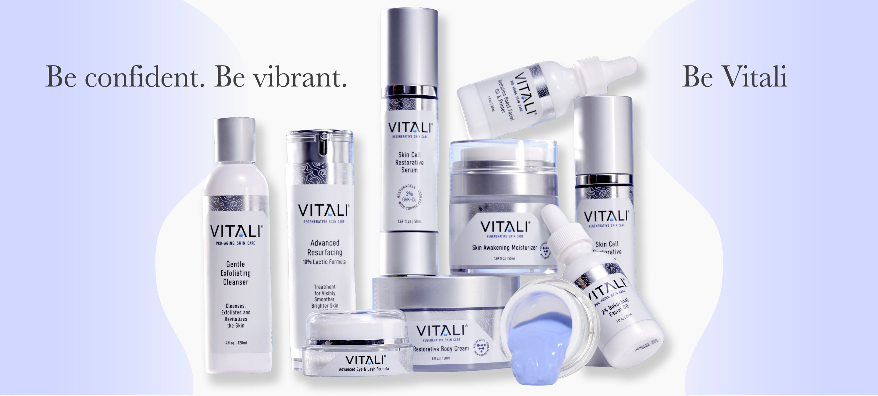 Vitali’s GHK-Cu skin care collection contains the precise amount of Copper Peptides (GHK-Cu) for optimal results. The rich blues in our products show that our formulas are some of the most potent on the market allowing deep penetration to generate collagen and elastin, signal the production of more youthful skin, neutralize wrinkle-causing free radicals and much more.