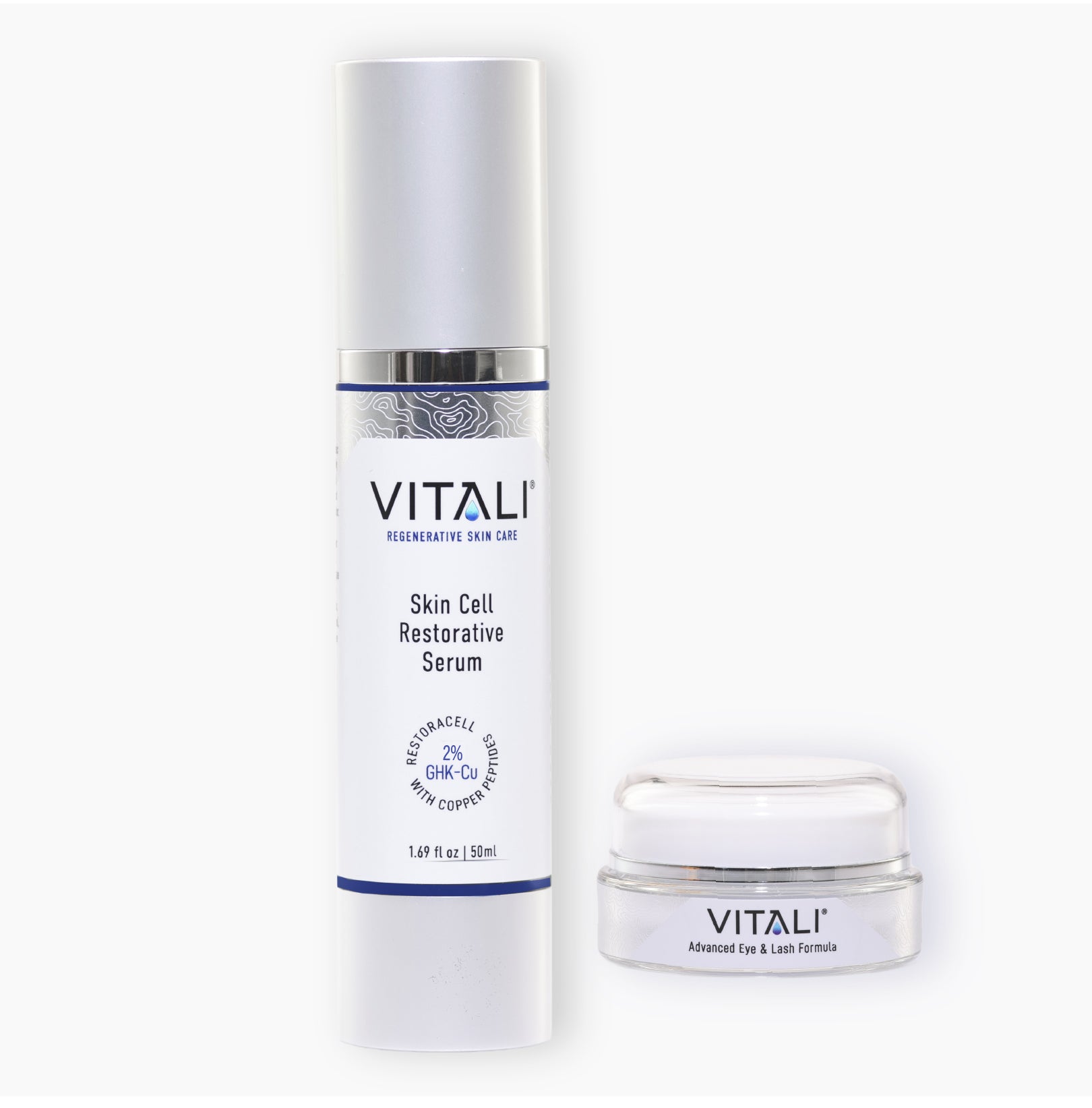 Our 2% GHK-Cu Skin Cell Restorative Serum lays the groundwork for a revitalized complexion, while the Advanced Eye & Lash Formula, a 4-peptide hero, specifically targets fine lines, dark circles, and puffiness around the eyes. It's the perfect routine for noticeable improvements in skin texture, firmness, and overall radiance with minimal effort.
